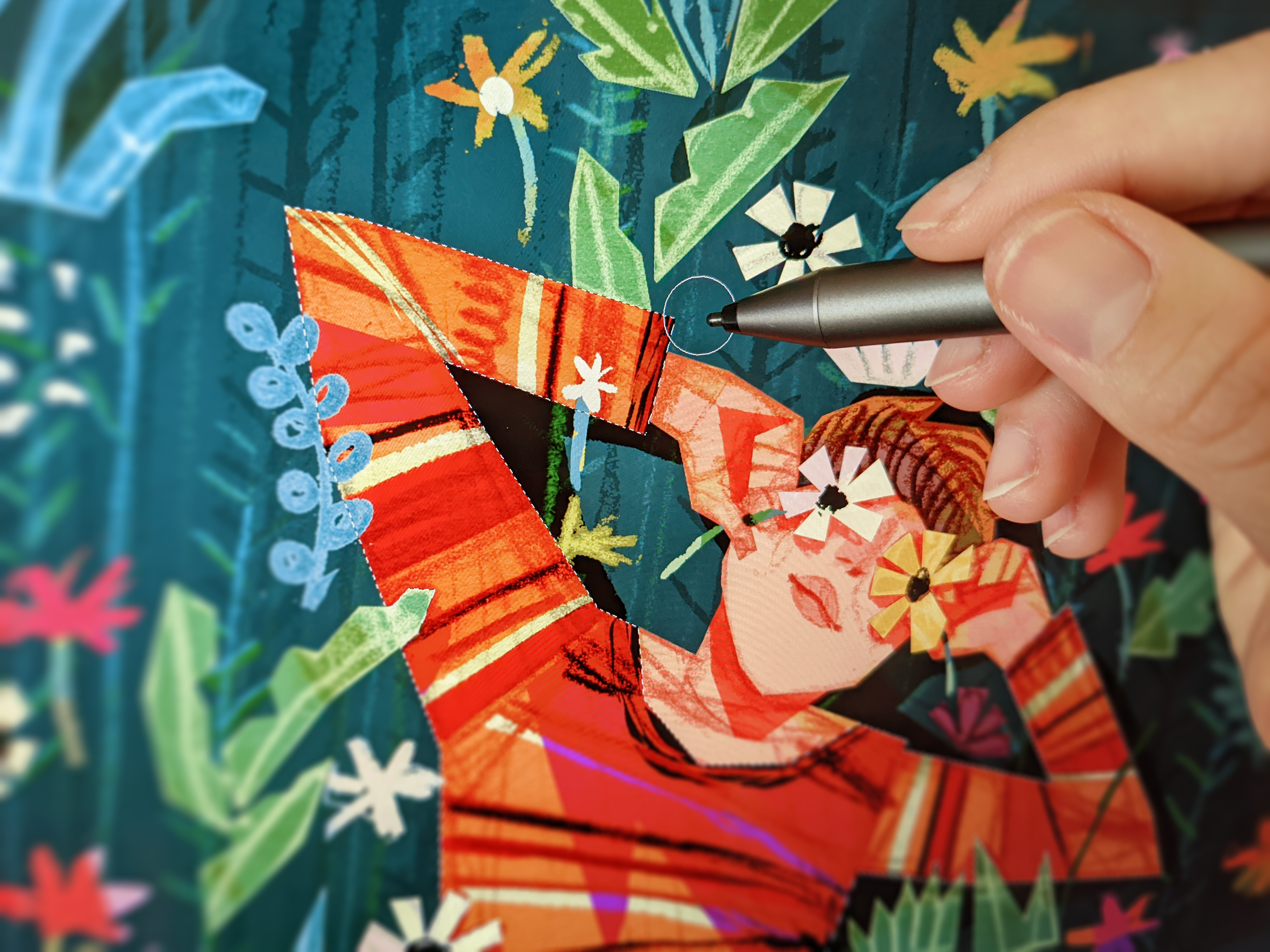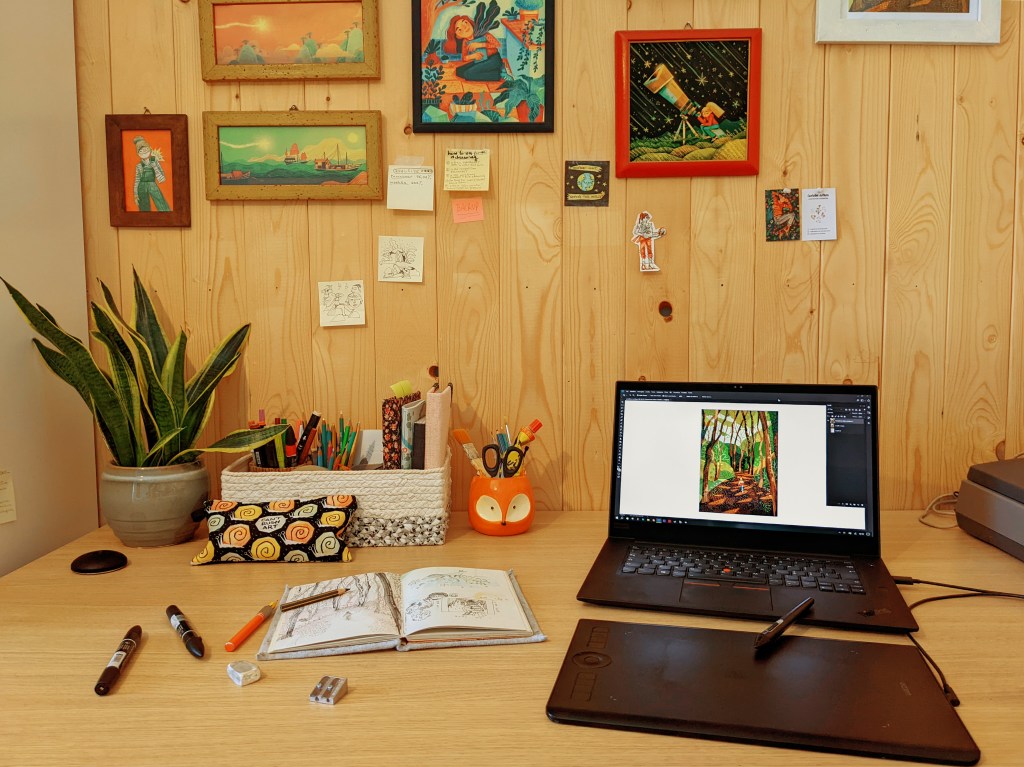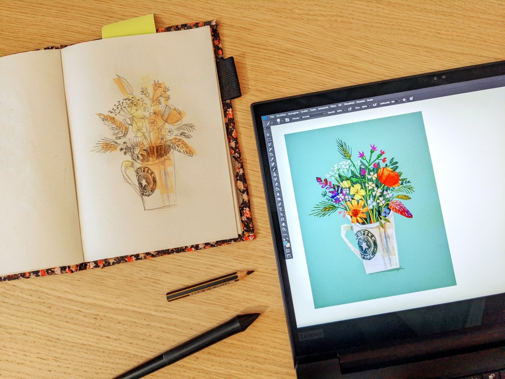 Sometimes, especially for big client projects, I sketch roughs digitally with this nifty little pen I have that works on my laptop screen. And I use, I kid you not, the Windows Snip & Sketch app: it’s supposed to be just a note-taking tool, but it’s fluid on the battery, it keeps my laptop ice cold, and the limited colors force me to create effective and contrasting color palettes.