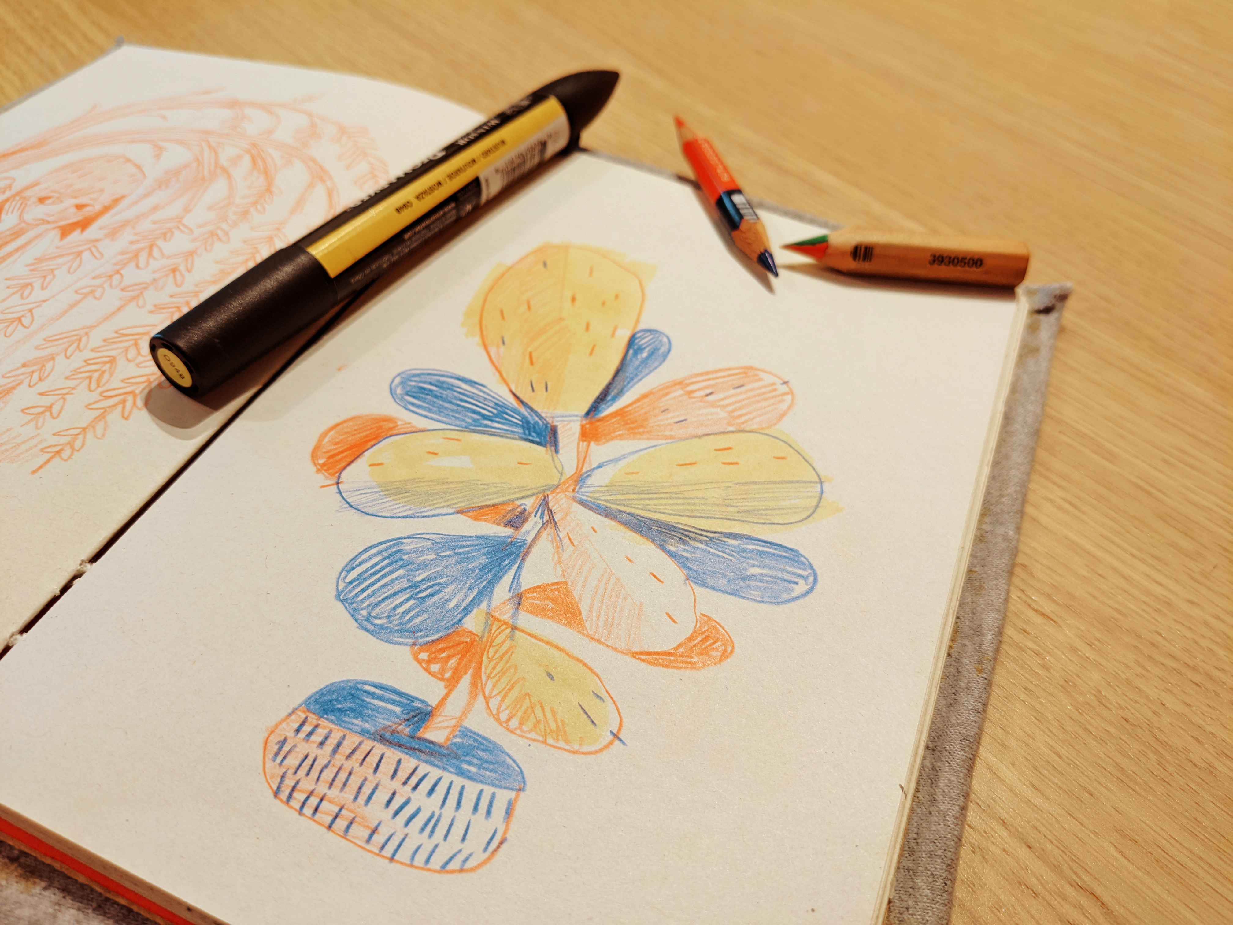 I normally sketch with dark colored pencils and semi-dead markers, but one of my secret weapons is…the rainbow jumbo pencil they give to kids. I love it because you never know which color you’re gonna get, and this lack of control works well for me.