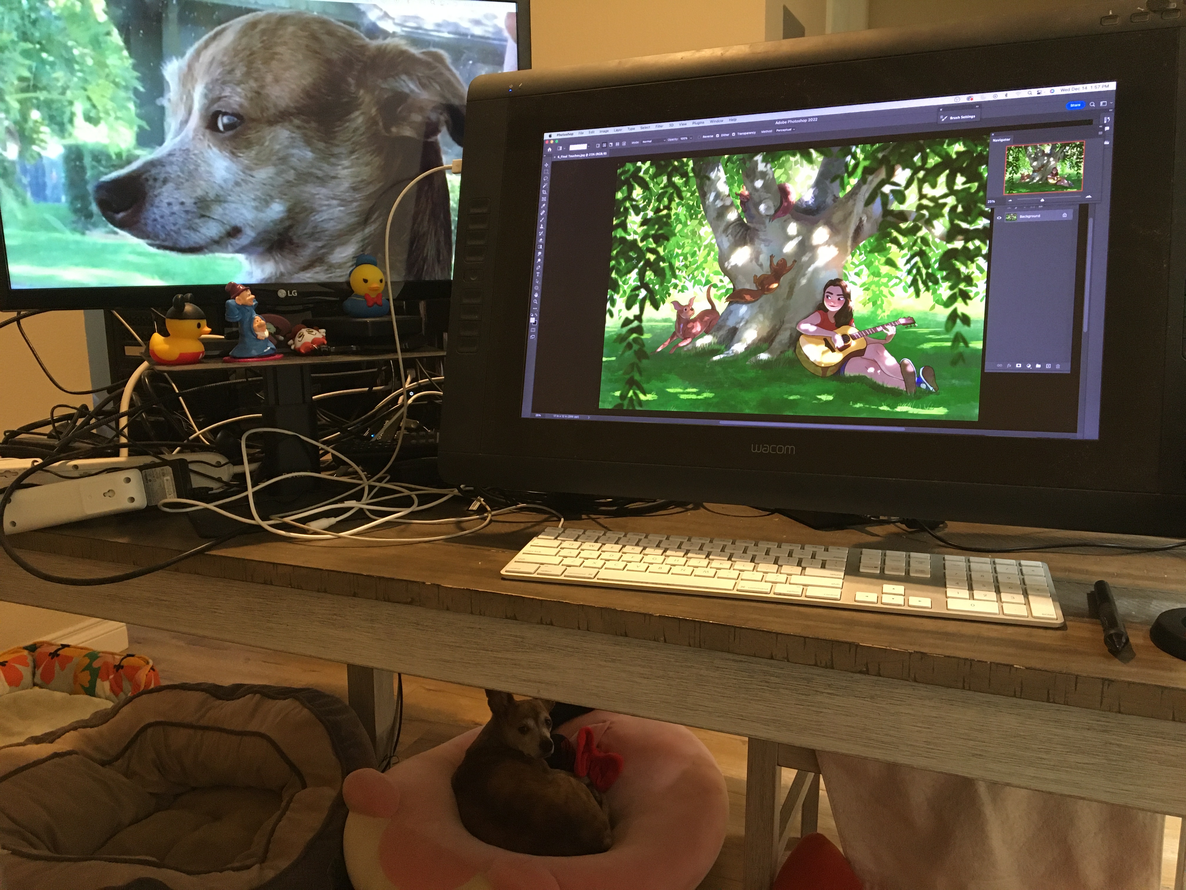 Yaoyao is an art director, painter, illustrator and occasional animator. Over the years she has worked at Disney TV Animation, Warner Brothers Animation, Rick and Morty, Stoopid Buddy Studios, Starburns Industries, etc. Yaoyao enjoys creating stories with each painting, especially the ones with her dog Parker in them.