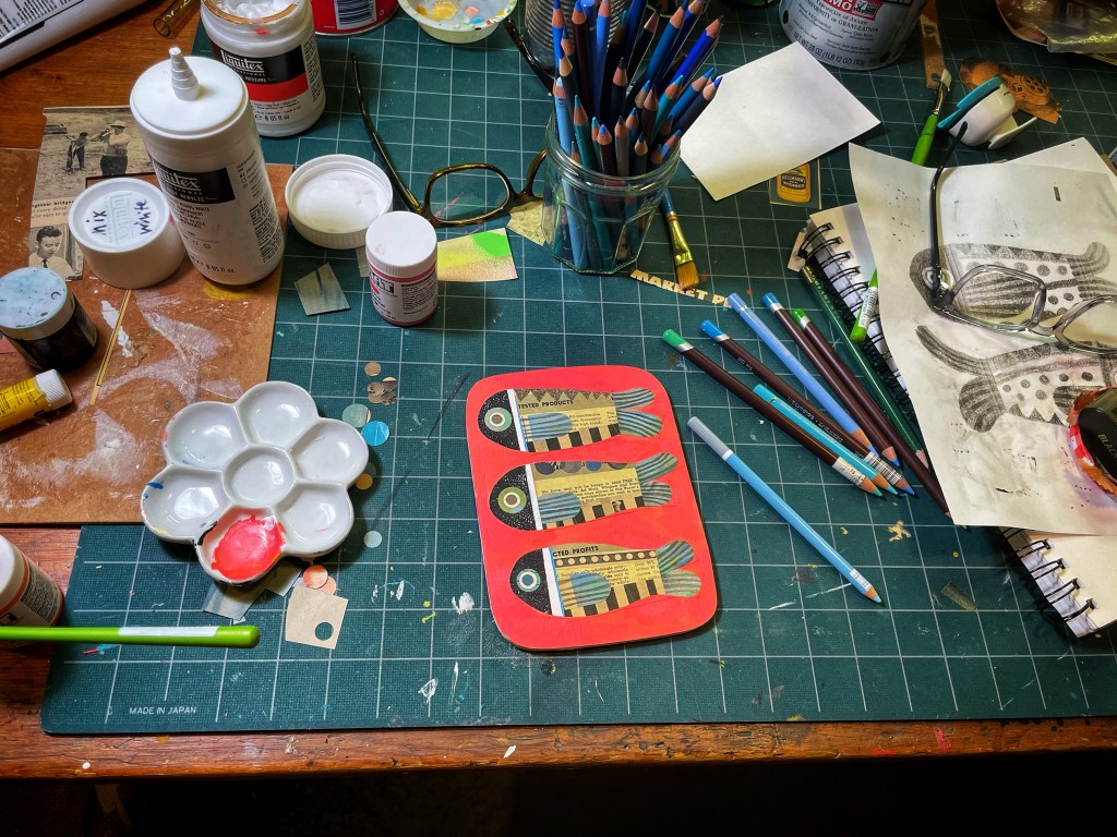 It’s probably not much different from anyone else’s. I show up every single day, and I draw and make, and I work; and while at the time I rarely feel like great “ideas” are landing, or that eagerly-awaited inspiration is hitting, at the end of the day I’ve usually made something I’m happy about, whether just a sketch, or a small collage, or even just writing a sentence that stays with me.