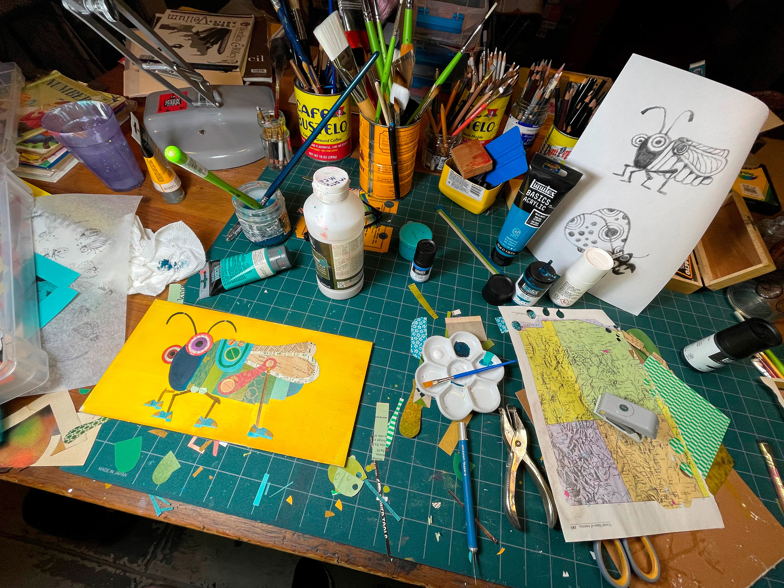 I use all sorts of mediums: I draw, I paint, I collage, and I work digitally. I’ve been really using my iPad a lot this year, making three children’s books with it and drawing dozens of illustrations as well.